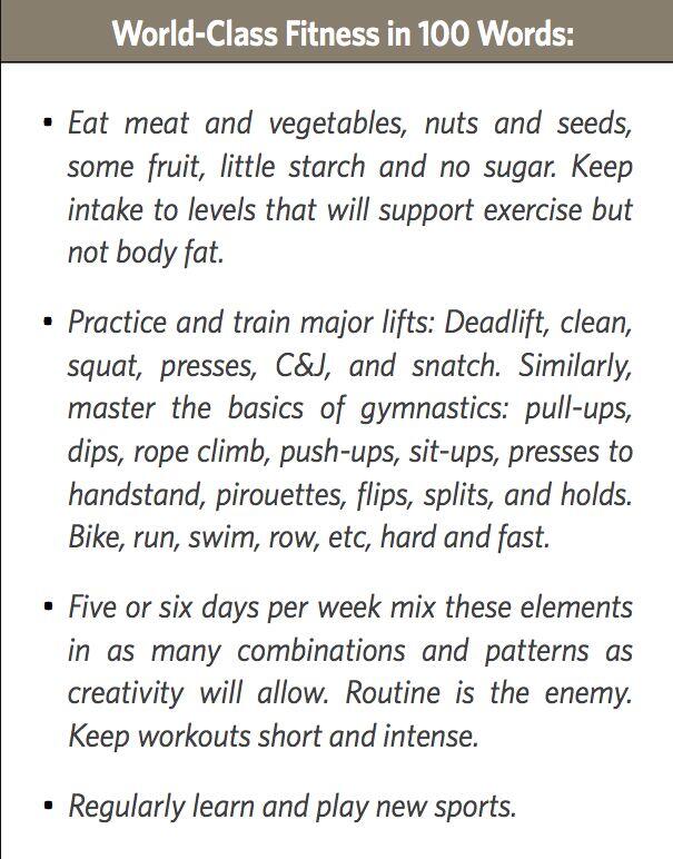 Eat a diet of meat and vegetables nuts and seeds some fruit little starch and no added sugar. World-Class Fitness in 100 Words. Try a Fitness Program Tailored To Your Abilities.